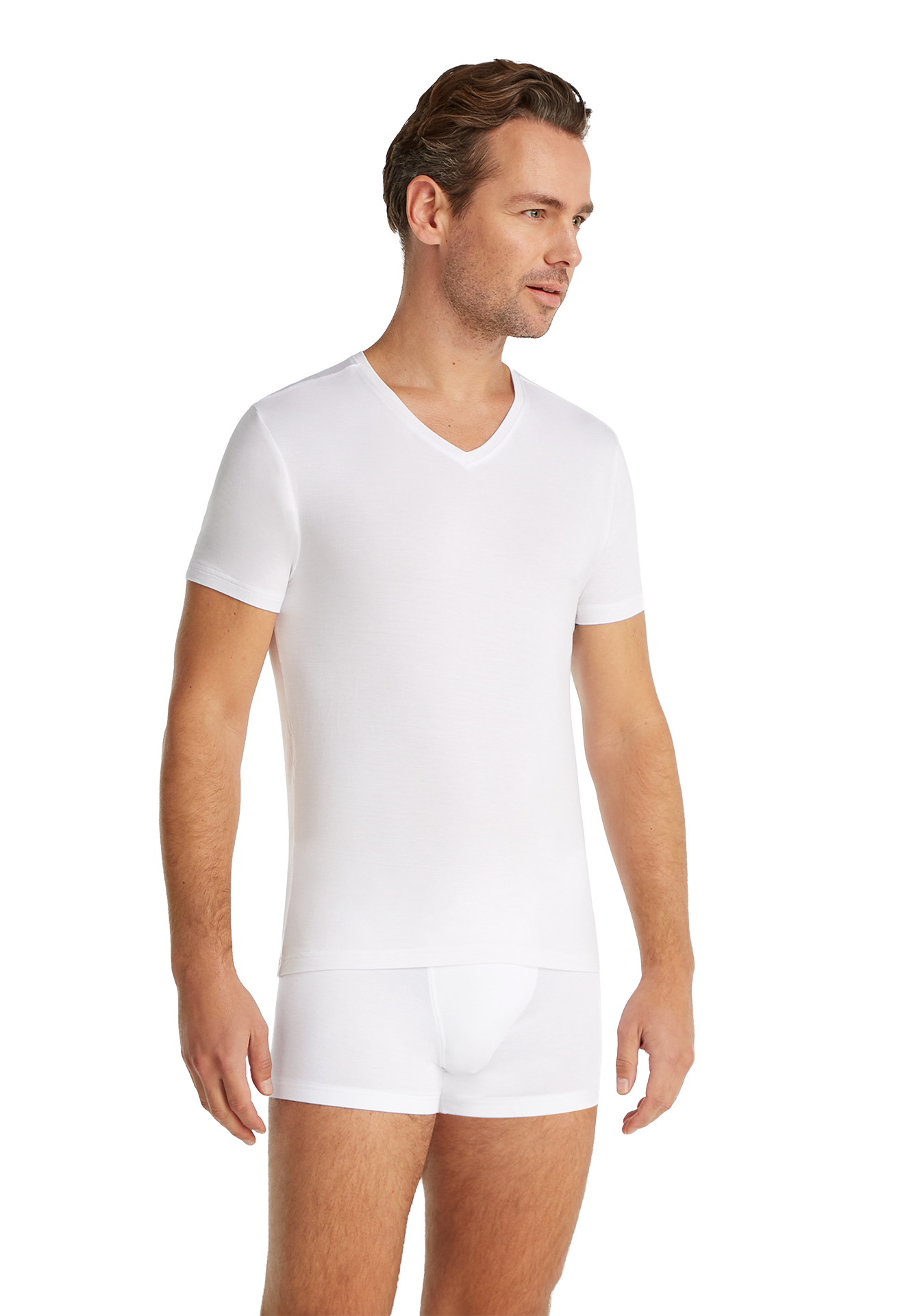 Heren T-shirt met V-hals van TENCEL™ Modal. De zachte, soepele stof vormt zich als een tweede huid en zorgt voor optimaal draagcomfort. Dankzij de ademende en temperatuurregulerende eigenschappen is het T-shirt geschikt voor dagelijks gebruik en actieve momenten.